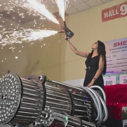 This device uses "cold spark" fountain refills, which produce a low-temperature effect that is safe to be near and poses no fire risk. It's designed for close-proximity use at events.