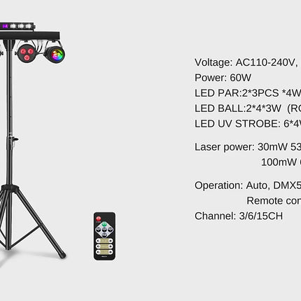 All-in-One System · Sound-Activated & DMX · Includes Stand & Carry Bag